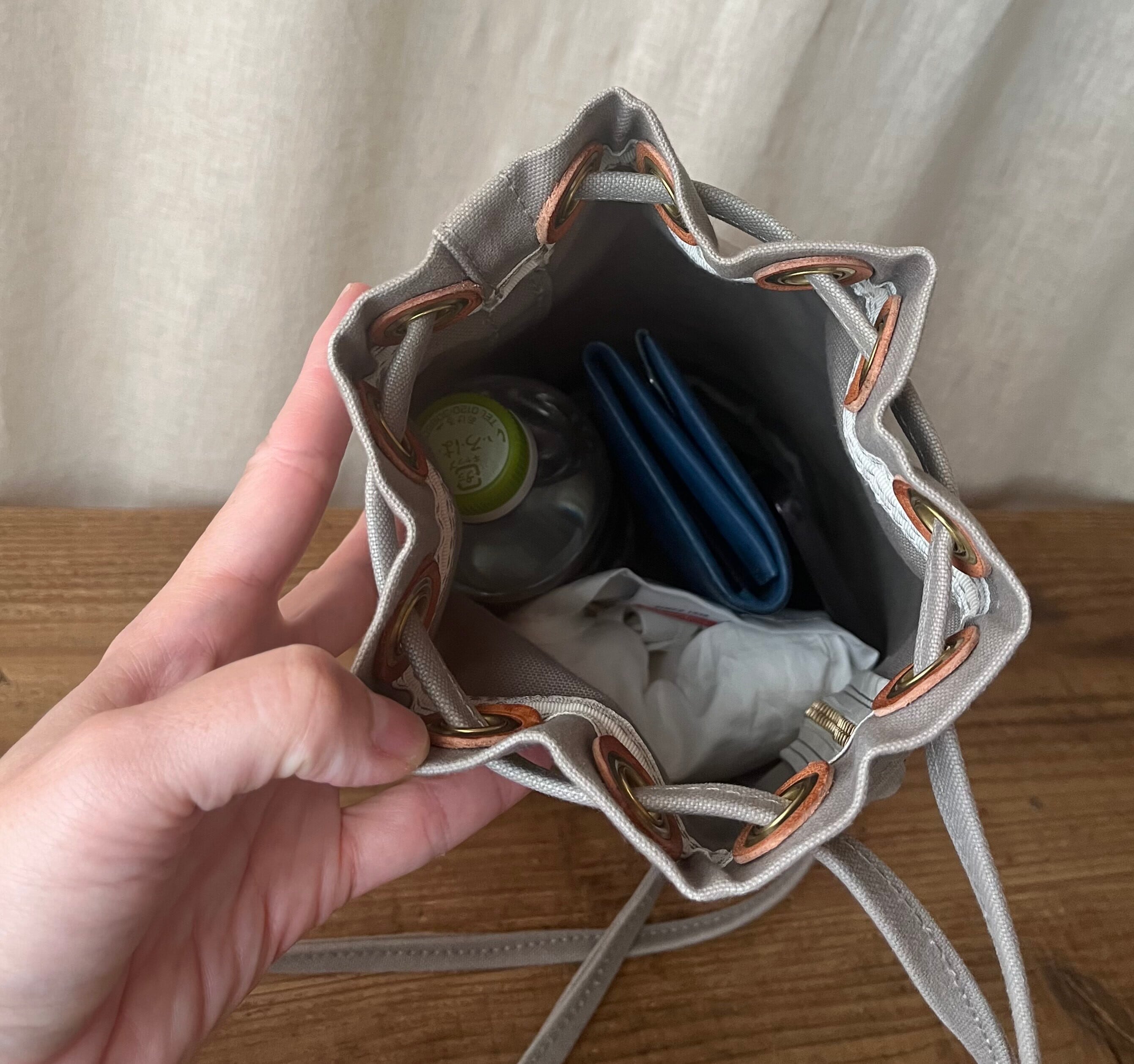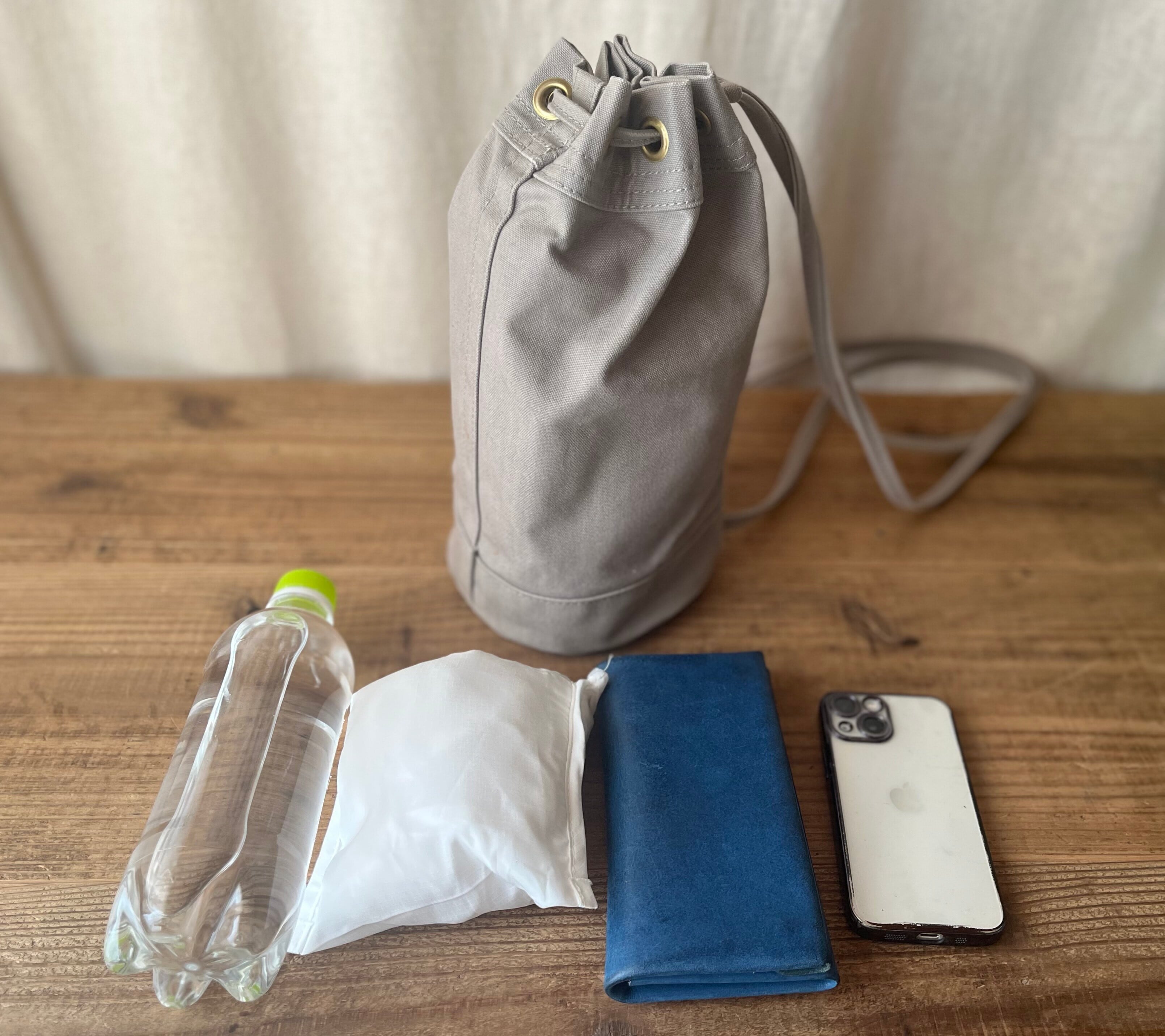 財布、携帯、鍵、小さめのポーチなど最低限必要な物が入る、小さめサイズです。