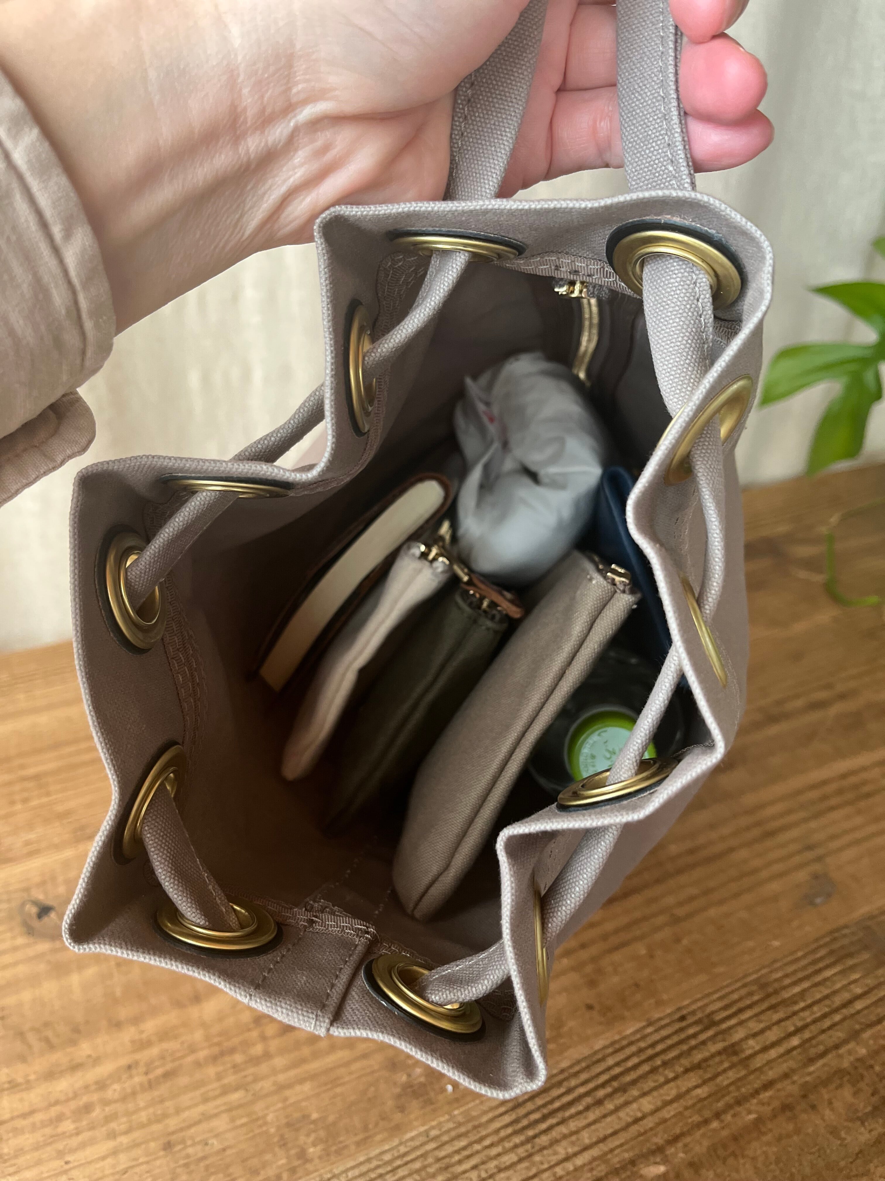 長財布、ペットボトル、携帯、鍵、ポーチなどが入るお出掛けに丁度良いサイズです。